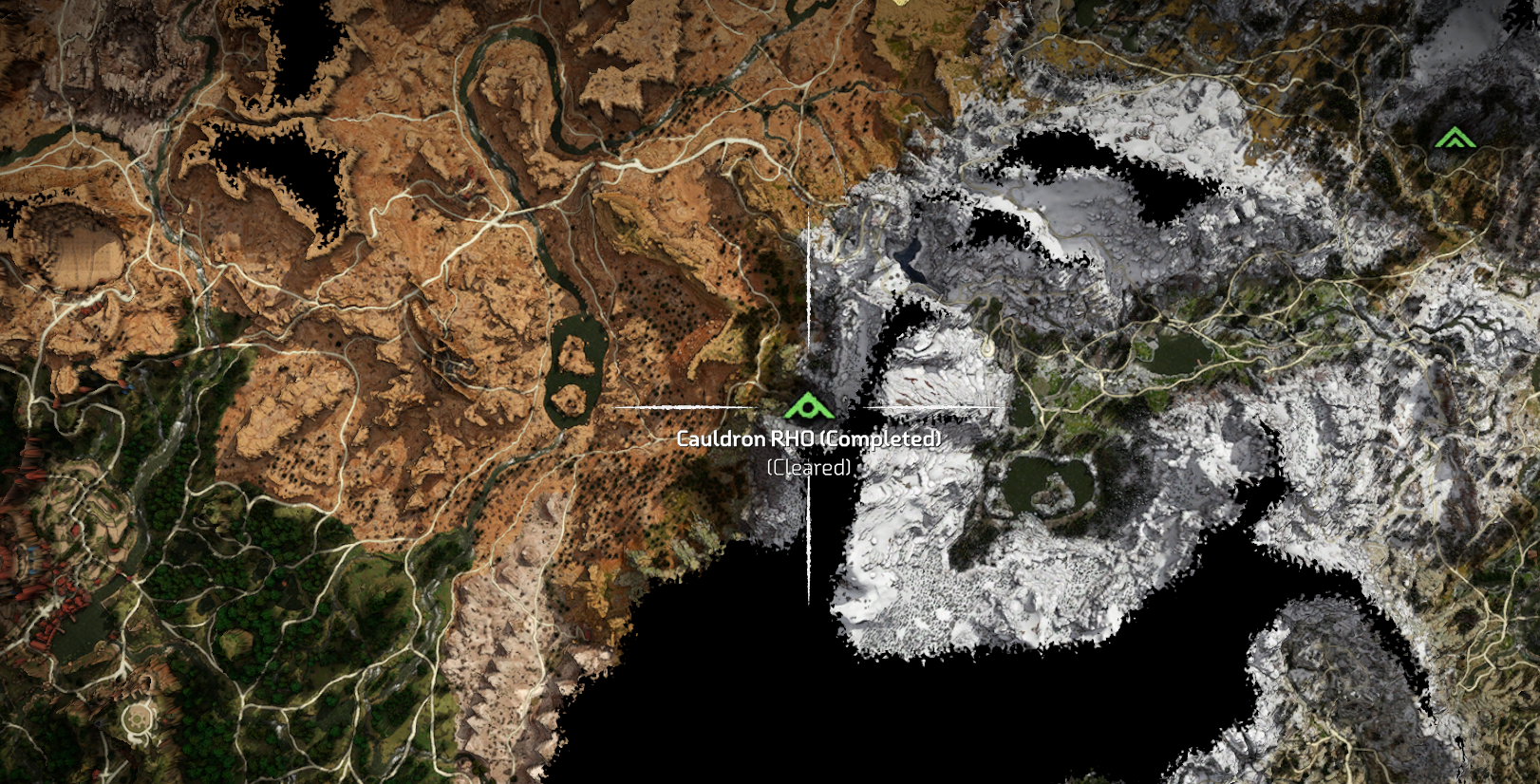 Climb up the marked ledges then follow the path around to the overridable node. Go through the water filled cavern and find a smaller tunnel on the left. Cauldron RHO Locate the Entrance This Cauldron can be found at the base of the western side of the mountain range directly south of the Carja fort of Daytower in the Carja Territories.