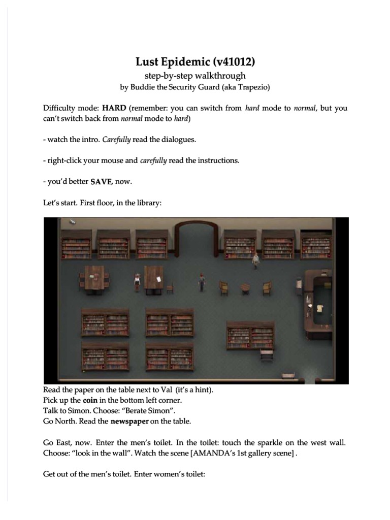 Maps are included and pictures of locations can be found at the end of this document or by Ctrl Clicking on the underlined links. Walkthrough PC Added on. Lust Epidemic v41012 step-by-step walkthrough by Buddie the Security Guard aka Trapezio Difficulty mode.
