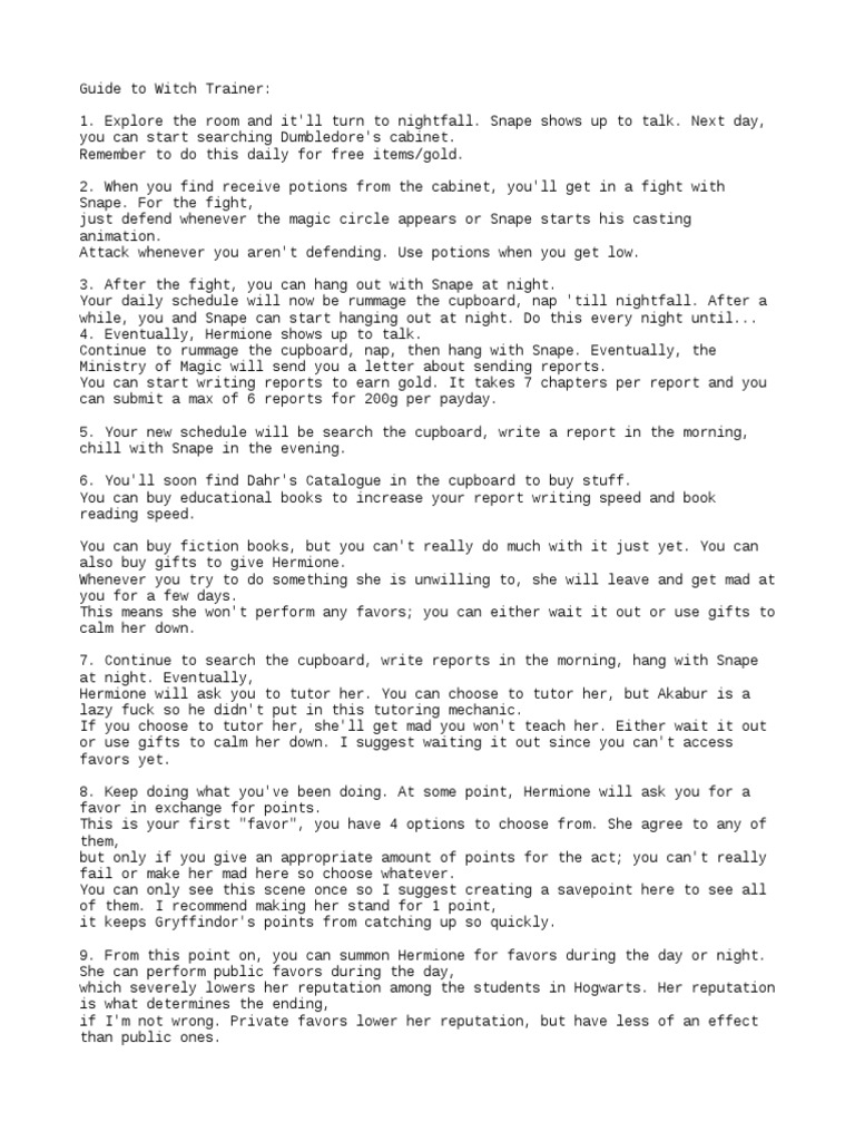 WVM 094 Download PC Game Walkthrough Free for PC. Sadly they are not bountiful. Go to Jacks room. Remember to do this daily for free itemsgold. When you find receive potions from the cabinet youll get in a fight with Snape. Snape shows up to talk. Optional can be skipped 1 By searching the cubboard every day you should find 2. Witch Trainer Walkthrough - Witch Hunter Trainer Gameplay Youtube - Just remember that comrade akabur has not officially stated he will. Raw download clone embed print report. Flirty F Game Walkthrough Download for PC.